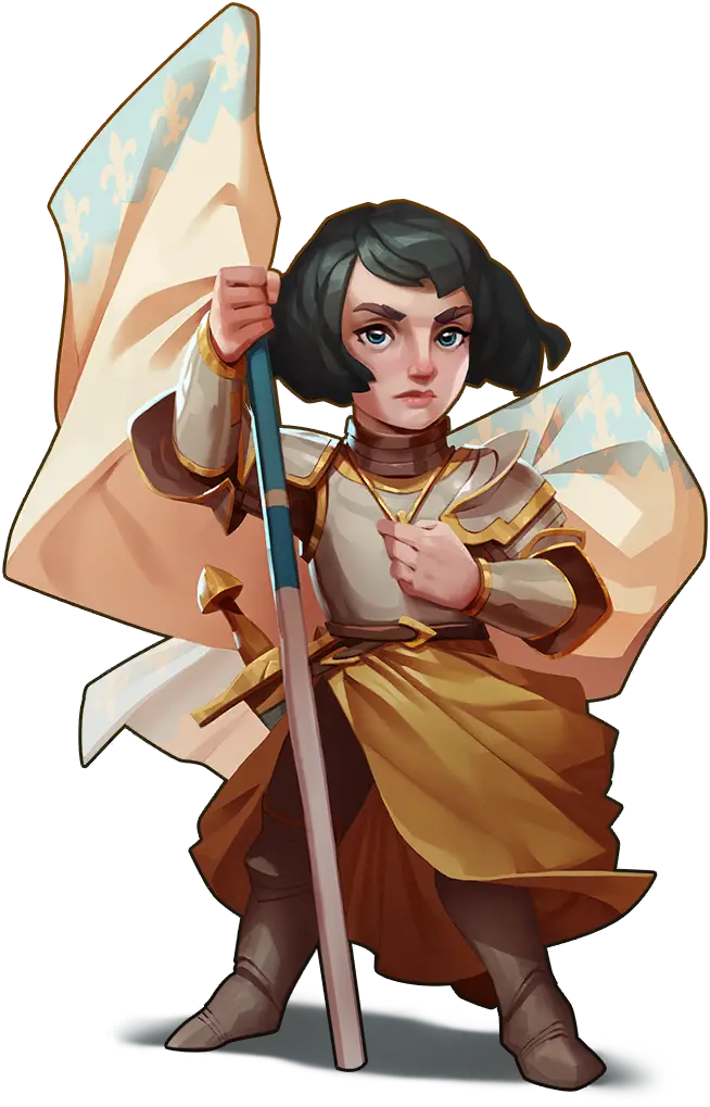 2Calls for divine assistance targeting the biggest cluster of enemy units, dealing 136.7% damage in a range of 2. Also heals the biggest cluster of friendly units by 101% of Joan's base damage in a range of {range}.